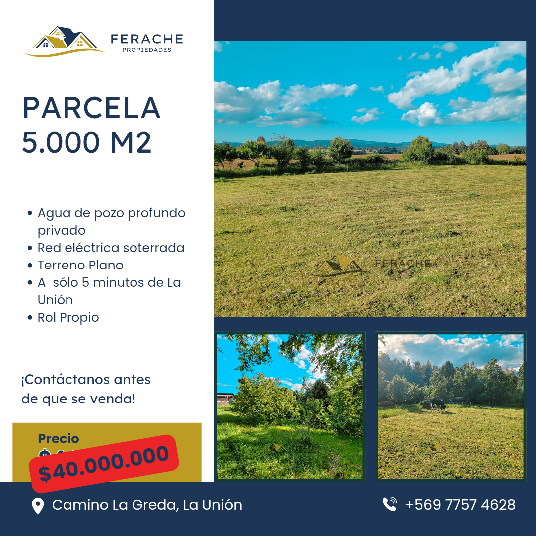 En Ferache Propiedades, te presentamos esta hermosa parcela ubicada a menos de 5 minutos de La Unión, en un sector tranquilo y natural, ideal para tu nuevo proyecto.